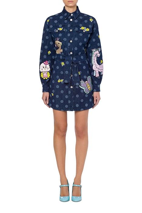ANIMAL PATCH POLKA DOT DENIM DRESS BLUE