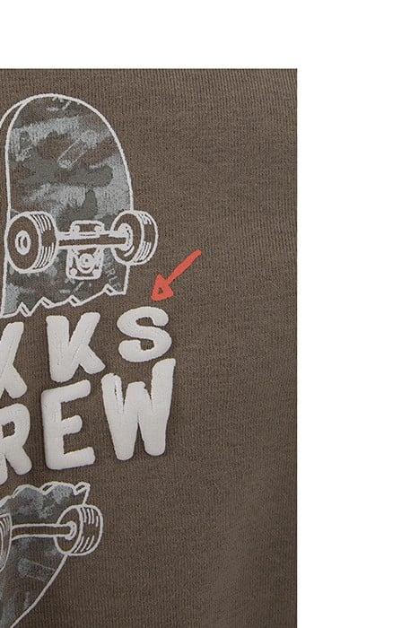This Pair Of Baby Boys’ Joggers Have Graffiti Street Art Inspiration. Wear Them With The Khaki Sweatshirt With A Skateboard Image.