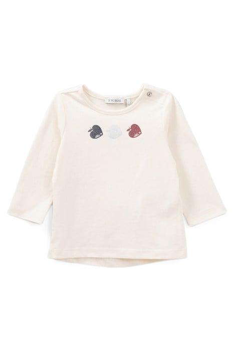 Blue Denim Dungarees With Ruffled Straps On An Ecru T-Shirt With A Print Featuring Three Apple-Hearts, Showing Love For An Outfit That Can Be Worn Together Or Separately.
