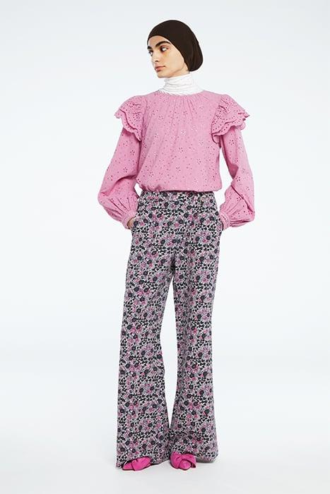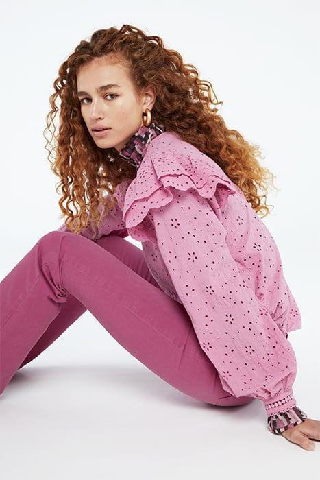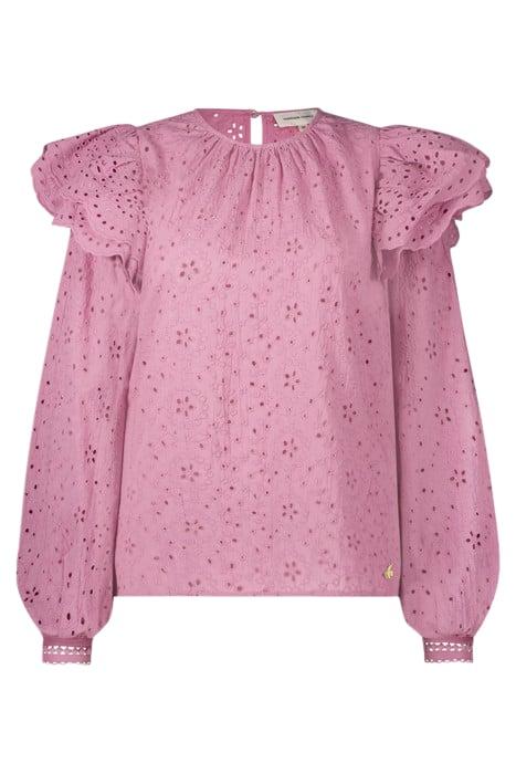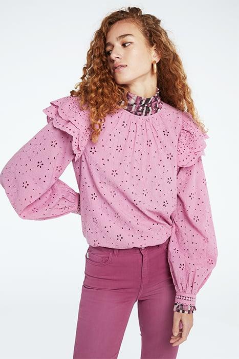 Pink Round Neck Top With Balloon Sleeves With Shoulder Ruffle. Bailey Blouse Has Openwork Floral Details And Is Made Of 100% Organic Cotton: Soft, Comfortable And Sustainable (Gots Certified).