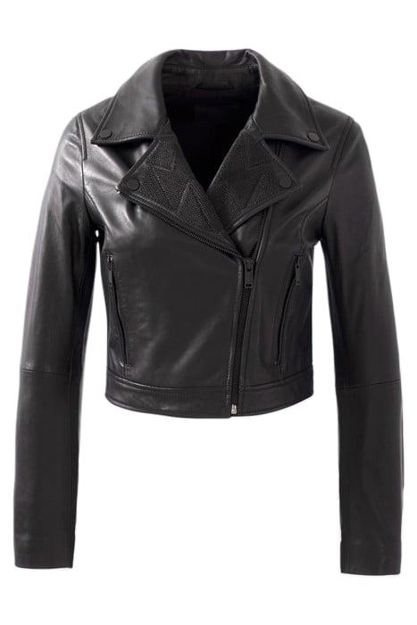 BLACK BIKER-STYLE LEATHER JACKET WITH CHAINS