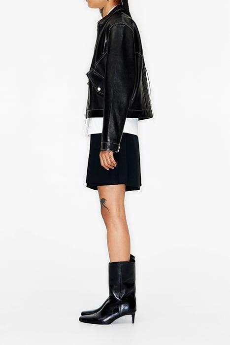 Short Black Leather Jacket. Straight-Cut Design With A Shirt Collar, Long Sleeves And Front Zip Fastening. Front Flap Pockets.