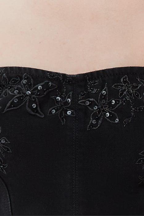 BLACK DENIM BUSTIER WITH EMBROIDERED FLOWERS