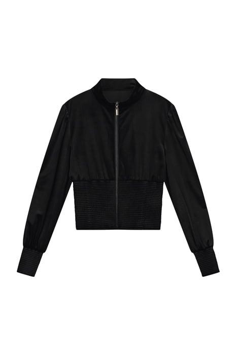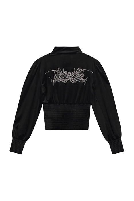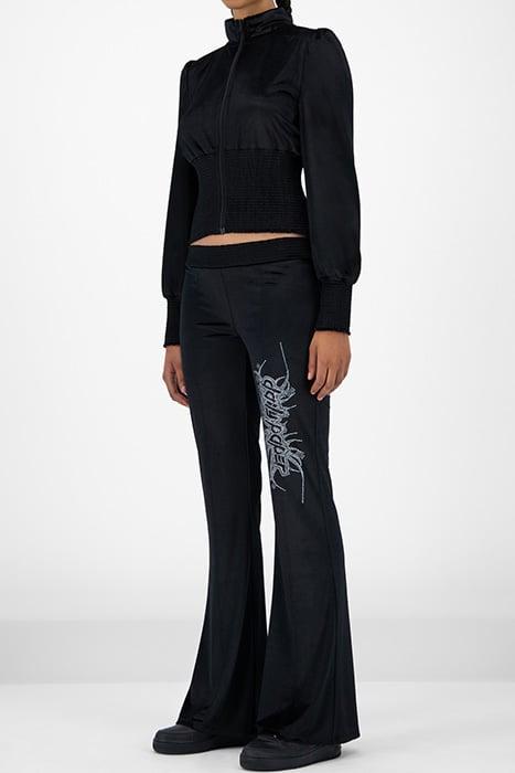 An understated take on a classic track top, this jacket blends nineties hip-hop styling with country music detailing. Constructed from a sporty and super soft velour fabric with rhinestone logo branding on the back, the secret to this jackets uber-modern silhouette is its pleated inset shoulders which add volume to the chest and top of the sleeves alongside an elongated waistband and cuffs.
