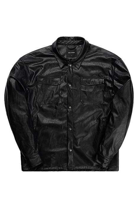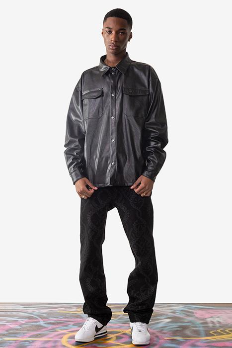 The classic overshirt gets a modern refresh, this layering piece is crafted from poly-blend fabric for a leather look and feel and features bright neon graffiti script on the back yoke. This shirt blends classic details like hand welt pockets and metal shield branded snap buttons with asymmetrical chest pocket flaps for an edgy style. Pair with Laith Pants for a head to toe leather look.