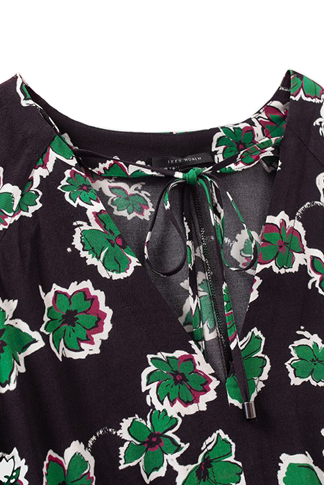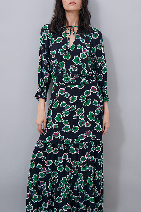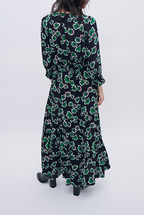 A Key Wardrobe Piece For Several Seasons Now, This Long Dress Has A Bold Green Flowers Print In Green And Black. We Love The Smocking Details On The Sleeves And Back.