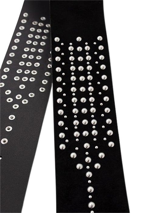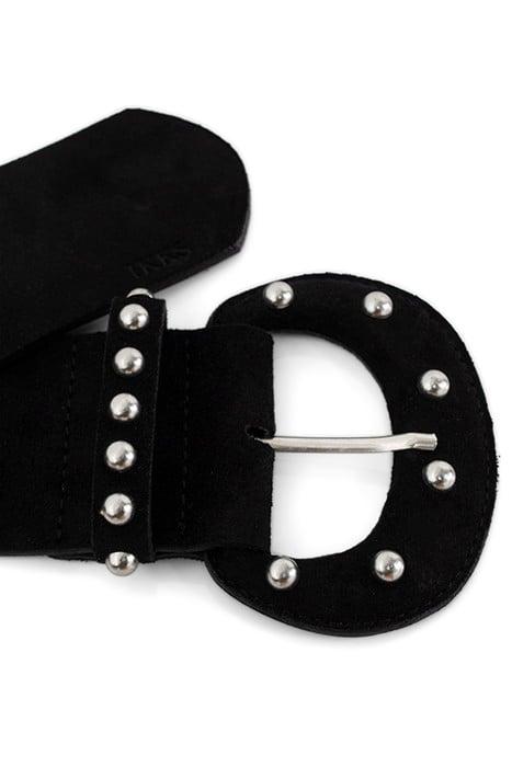 On The Length, Loop, Buckle. Rock Signature Studs Are All Over This Black Sued Wide Belt. Wear With A Dress, A Skirt, A Jacket.