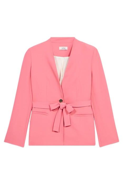 Stretch Crepe Fabric Blazer Jacket, Closing With Single Metal Button, Sash To Tie In A Bow At The Waist, Faux Welt Pockets At The Front, Contrasting Colour Lining.