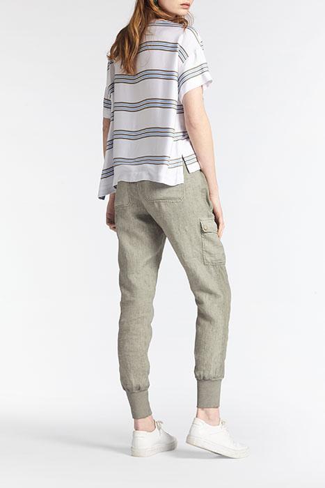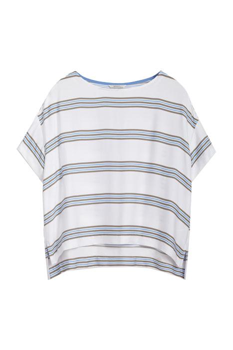 Een oversized T-shirt met meerkleurige, horizontale strepen. De top heeft een boothals en zijsplitten.