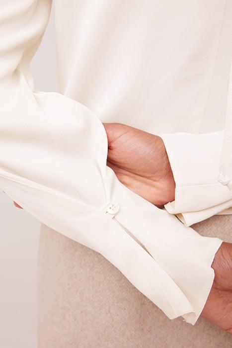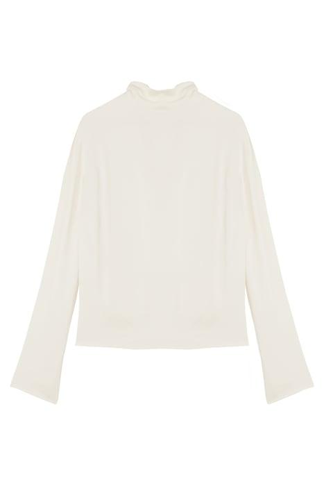 Feel stylish in this fantastic top. This new style has a soft turtleneck that flows into an elegant exposed back. The sleeves have a relaxed fit and a seam creating a rounded shape. A button at the bottom can be closed to create an elegant pleat at the reverse of the sleeve.
