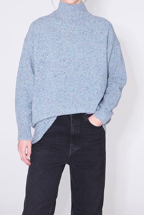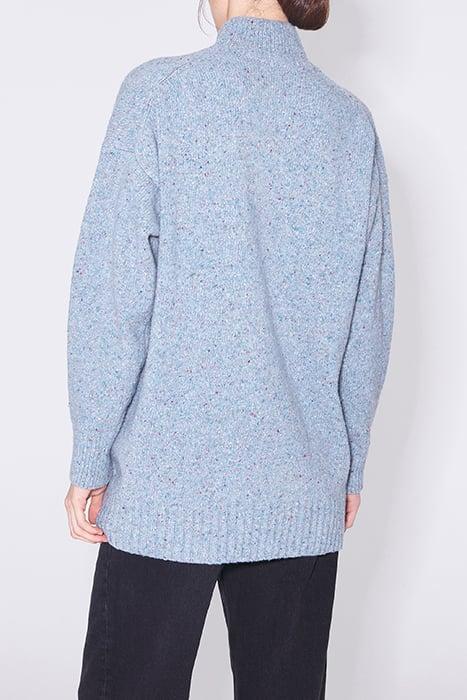 Thick Knit Alpaca Wool Sweater In Blue Marl. Straight-Cut Design, Long Sleeve, High Neck, Above Hip Length.