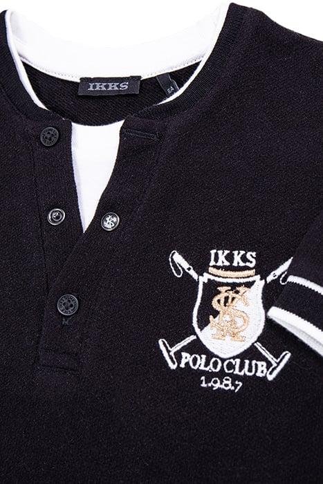 A Successful Trompe-L'Oeil Effect For This Black Boy'S T-Shirt. The Collar Opens Onto Another White Collar, And An Embroidered Coat-Of-Arms Decorates The Chest.