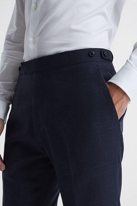 Embrace Understated Patterns With The Blue Broadgate Trousers, Fabricated From A Rich Wool Blend Into A Classic Prince Of Wales Check. They Feature Side Adjusters On The Waistline To Aid Wearability. Pair With Our Matching Blazer And Style With A Crisp White Shirt For Timeless Style.