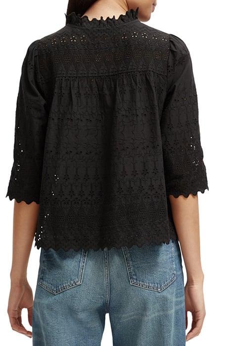 Elevate your summer wardrobe with this stunning Broderie Anglaise Top in black from Scotch & Soda. Crafted from delicate broderie anglaise fabric, this top exudes effortless elegance and feminine charm. The intricate cut-out detailing adds a touch of sophistication, while the relaxed fit ensures comfort all day long. Pair it with your favorite denim shorts or a flowy skirt for a chic and stylish look. Whether you're heading to a brunch with friends or a casual day out, this top is the perfect choice for any occasion. Add a touch of romance to your outfit with the Scotch & Soda Broderie Anglaise Top.