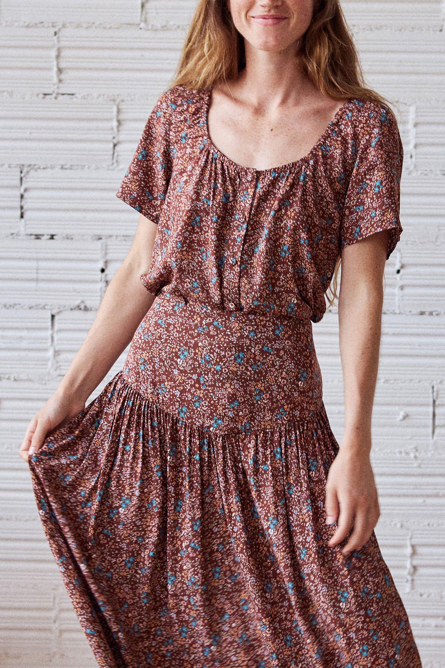 Reminders Of The Last Flowers Of Summer. A Flowy Sustainable Skirt With Vibrant Autumn Tones. Features A Dropped Waist And Triangular Gathered Pattern, Side Zipper And Side Pockets.