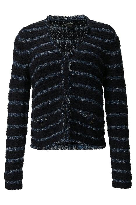 Knitted Cardigan: Details: Fringes, Sequins, Striped Detail, Feature: Soft, Elastic, Structured, Warm, Neckline: V-Neck, Sleeves: Long Sleeves, Fit: Regular Fit, Closure: Hook And Eye, Fabric: Knitwear, Lining: Unlined.