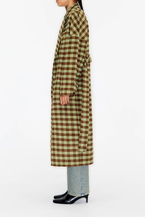 Checked Double-Face Coat In Green Brown. Tailored Model With Lapel Collar And Double-Breasted Fastening With Two Buttons. Buttoned Cuffs And Side Pockets.