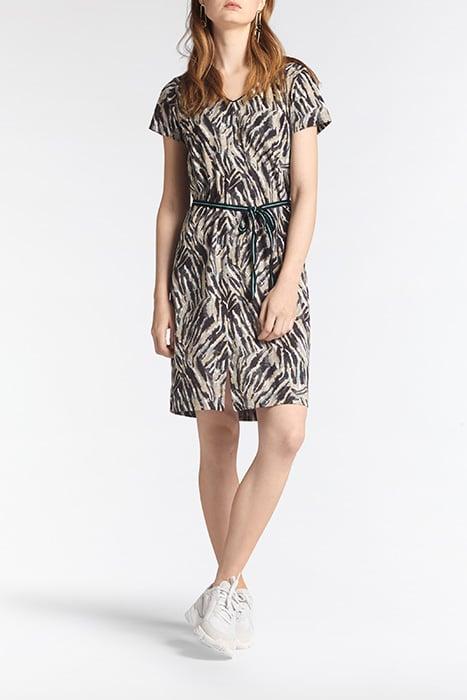 Korte tricot jurk met abstracte print in meerdere tonen. De afgeronde V-hals is afgewerkt met een contrasterende bies. De jurk heeft korte mouwen en kan getaiilleerd gedragen worden met de bijpassende ceintuur.