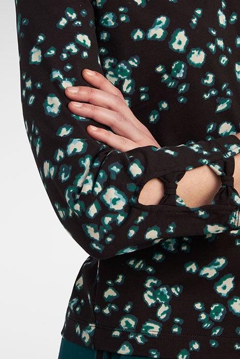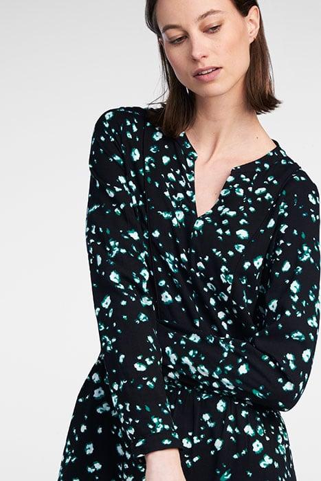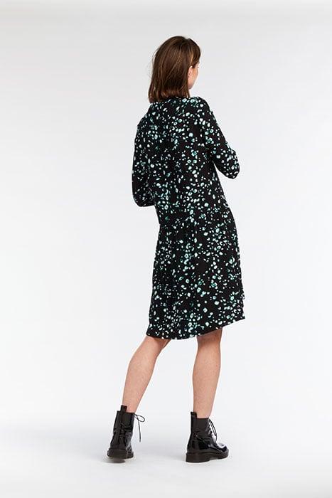 Het soepele viscose, het unieke dessin en de wijde pasvorm van deze prachtige jurk verzekeren jou van een comfortabele en luchtige outfit. Versierd met plooidetails is deze jurk afgewerkt met een bies. De ronde hals heeft een V-split en de lange mouwen zijn voorzien van een smalle manchet met een knoopsluiting. Draag de jurk stoer met een paar veterlaarsjes.
