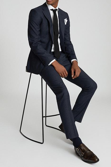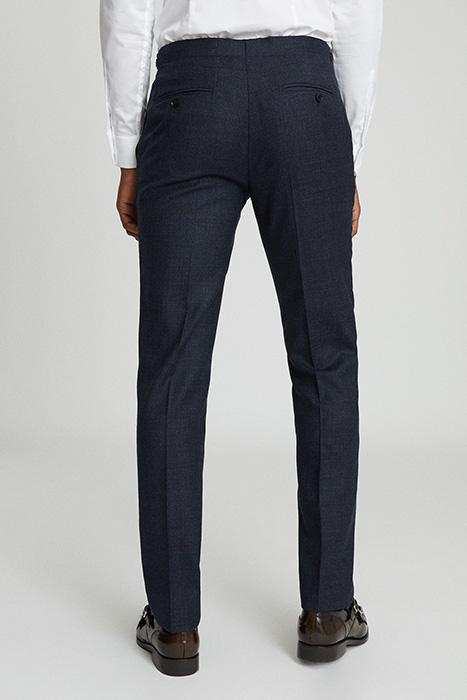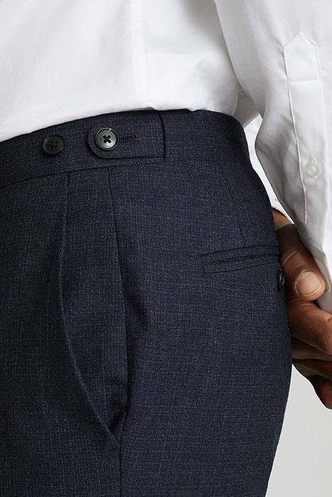 The Dunn trousers in navy blend formality with a hint of a contemporary edge in the form of the textured fabrication and slim cut. Style with crisp shirting and the matching blazer for a sartorial look. * Textured fabrication * Slash pocket to each hip * Side adjusters * Zip fastening * Jetted back pockets * Slim fit .