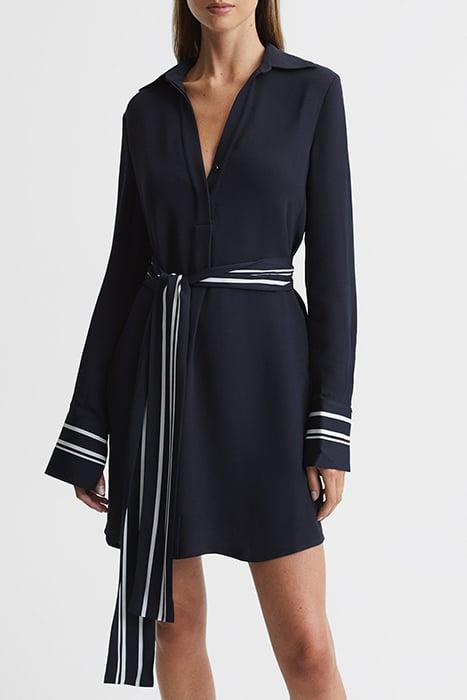 The Feya Dress Is A Unique Piece Designed With A Striped Tie Detail That Can Be Worn Around The Neck, Or Removed And Used As A Self-Tie Waist Belt. The V-Neckline And Mini Length Lend A Sense Of Allure, With The Oversized Cuffs Adding Impact To The Look. Simply Style With Heels.