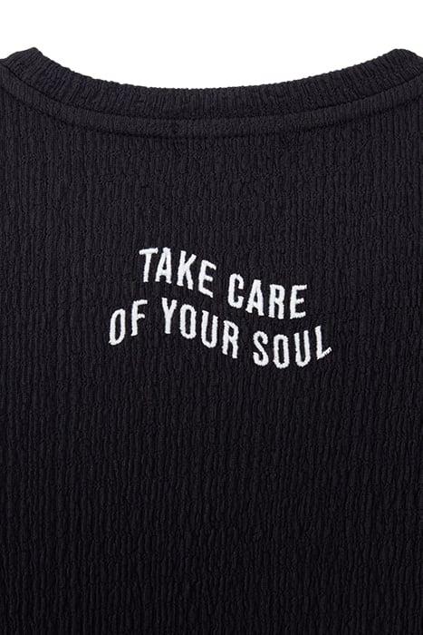 Textured Knitwear To Wear Snug Next To The Body. Black With A Checkerboard Stripe For The Winners. 'Take Care Of Your Soul' Embroidery On The Back. Go For This Super-Stylish Cropped T-Shirt.