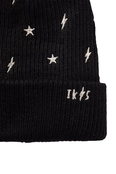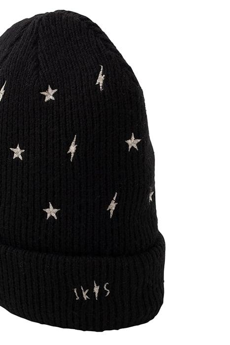 GIRLS’ BLACK KNIT BEANIE, EMBROIDERED GOLD STARS/LIGHTNING B