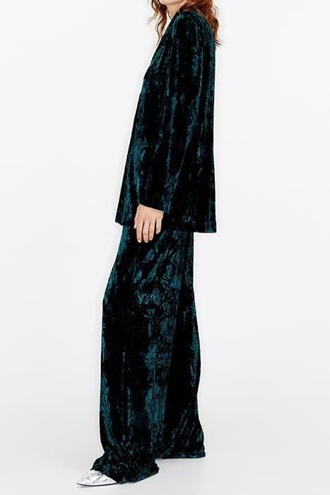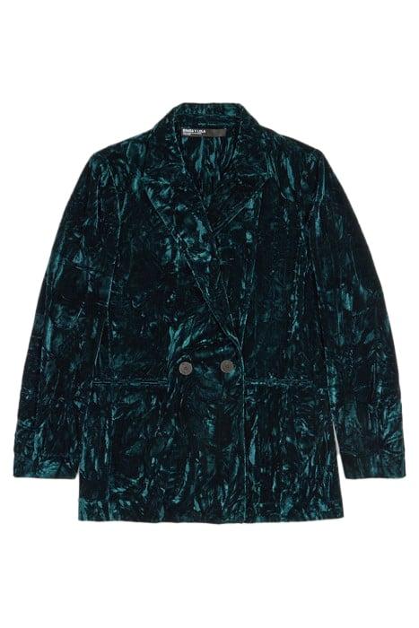 Velvet Blazer In Dark Green. A-Line Model, Lapel Collar And Long Sleeve. Double-Breasted With Buttons And Flap Front Pockets.