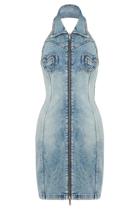 Stretch Denim Dress With Heart-Shaped Pockets And Zip On The Front.