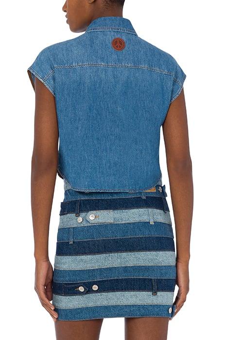 Short Sleeveless Shirt In Cotton Chambray With Heart-Shaped Pocket On The Front And Peace Symbol Patch On The Back.
