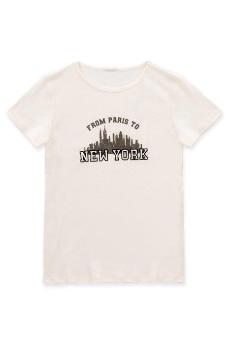 From Paris To New York. This Ivory Cotton And Linen Blend T-Shirt Has A Tagline In Flocked Velvet, Under The Emblematic Big Apple Skyline.