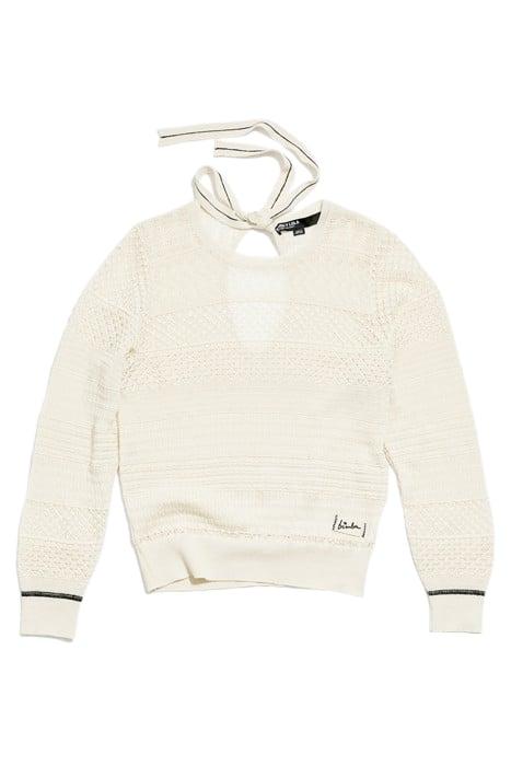 Sweater With Various Textured Patterns In Ivory. Straight Cut Model, Long Sleeves And Back Cut-Out With Tie.