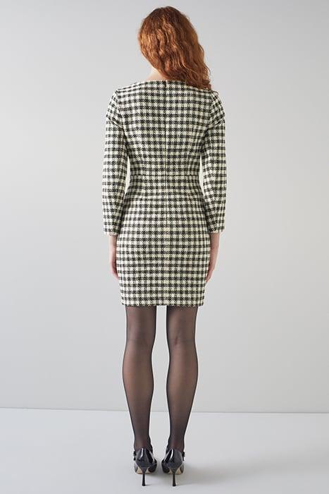 The Keeler dress is crafted in Europe from an Italian black and cream gingham tweed. It has a scoop neck, long sleeves, fully-functioning pearl buttons, patch pockets, a fitted silhouette and it falls to just above the knee.