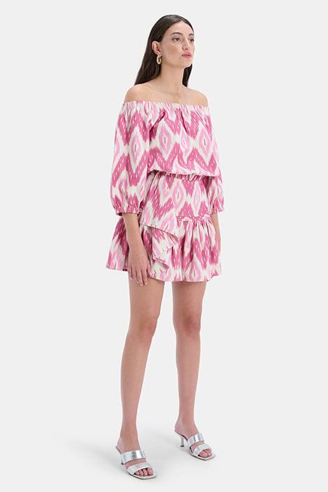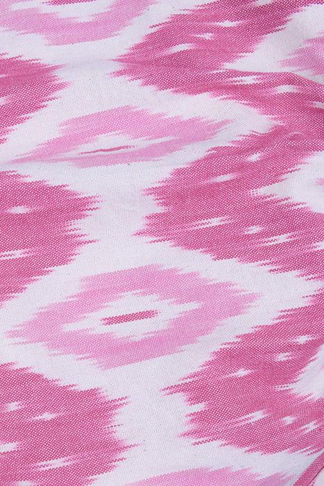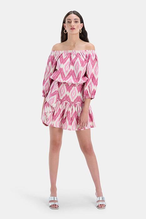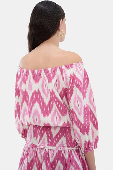 Color Up Your Summer Wardrobe! The Ikat Top Is Off Shoulder, Has Three -Quarters Of Sleeves And An Elastic Band At The Bottom. The Item Is Characterized By A White Color With A Pink All-Over Print. Furthermore, The Top Falls Shorter Because Of The Elastic Band. The Item Is Made Of An Ikat Fabric, Which Gives The Top A Unique Design. Combine It Together With The Matching Skirt For A Matching Look. The Model Has A Length Of 174 Cm And Wears Size S. The Item Has A Total Length Of 41 Cm In Size S