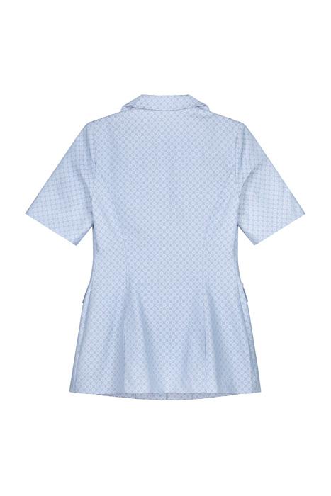 A contemporary take on the classic safari Blazer, this single breasted short sleeve blazer is constructed from our custom blue knit fabric. The patterned weave works in tandem with a woven label below the collar to give this workwear classic a modern twist. Tailored with princess seams which end in double vents to give a more feminine fitted shape. Comes with four patch pockets.