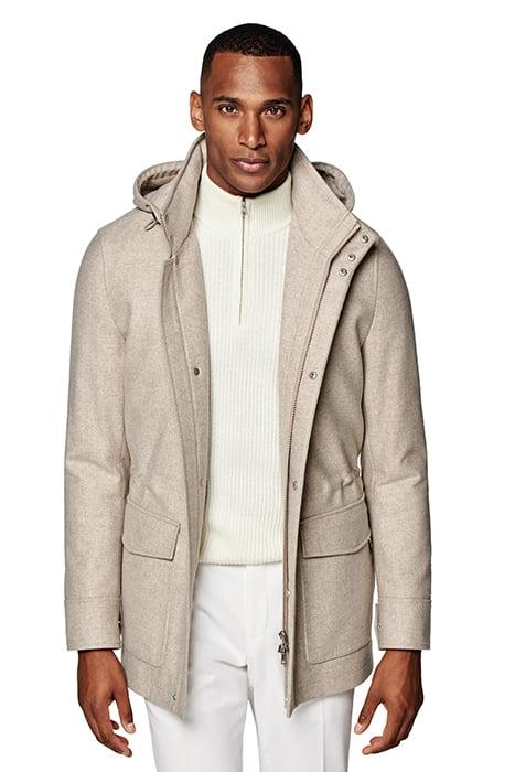 This Relaxed Light Brown Padded Parka Features A High Collar, A Hidden Zip And Button Closure, A Detachable Drawstring Hood And Padded Interior As Well As An Inside Waist-Cinching Drawstring To Adjust The Fit.