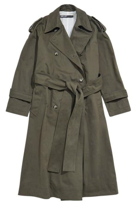 Long Trench Coat In Dark Khaki. Straight-Cut Design With A Shirt Collar, Long Sleeves, And Front Closure Fastened With Eight Buttons. Epaulets, Cuff Tabs, Side Pockets, And Belt. Striped Interior Lining.