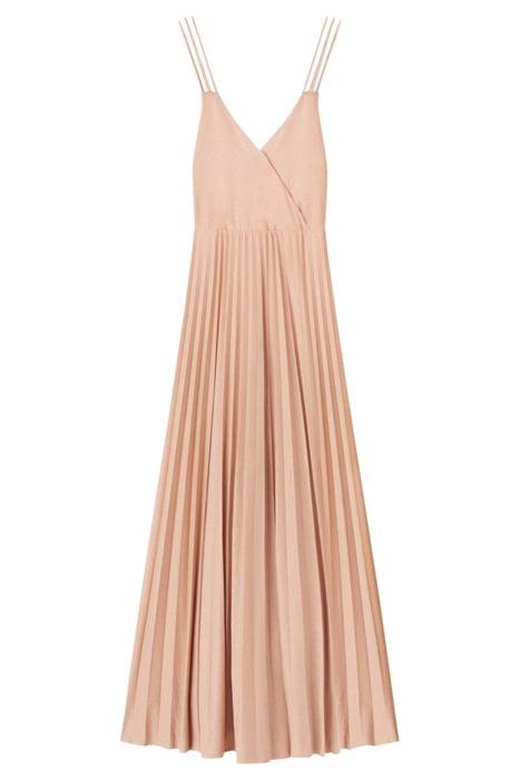 Elegant Lurex Jersey Dress, Front V-Neck, Fine Triple Straps With Crossover Pattern At Back, Inner Elastic Waistband, Long Skirt With Pleated Feature.
