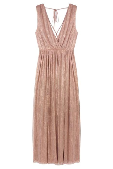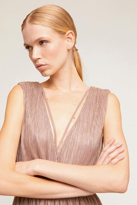 Elegant Long Lined Stretch Lurex Tulle Dress, Plunging V-Neck With Crossover Feature, Sleeveless, Waistband With Internally Inserted Elastic, Skirt With Micro-Pleated Feature.