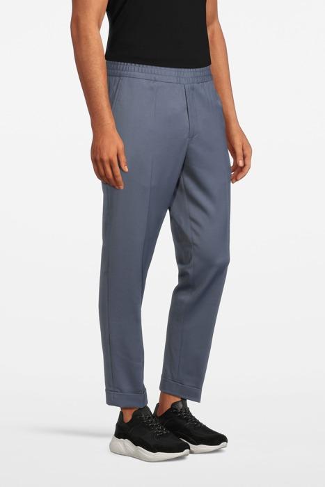 Gabardine pants with elasticated waistband and drawstring, f unctional front fly, crease marks, folded bottom hem.