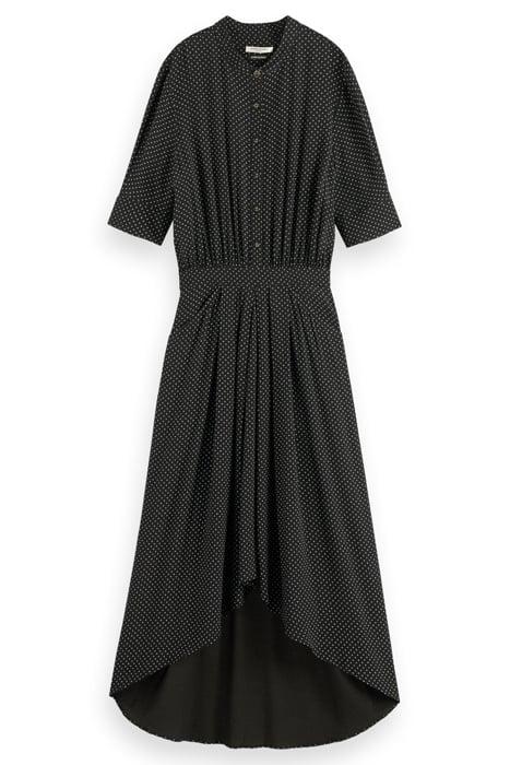 Introducing the stunning Midi Dress with High-Low Hem from Scotch & Soda, available in a sophisticated polka dot print in evening black. This elegant dress is perfect for both formal occasions and casual events, making it a versatile addition to your wardrobe.