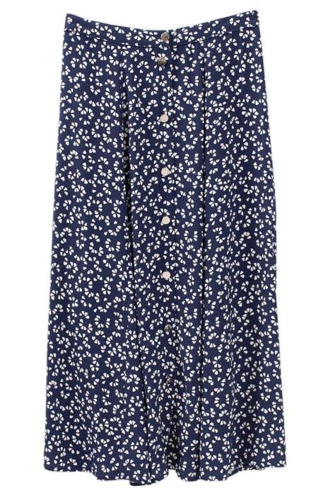 Navy Long Flared Skirt Two-Tone Graphic Print Elasticated Waist, Buttons On Front To Fasten