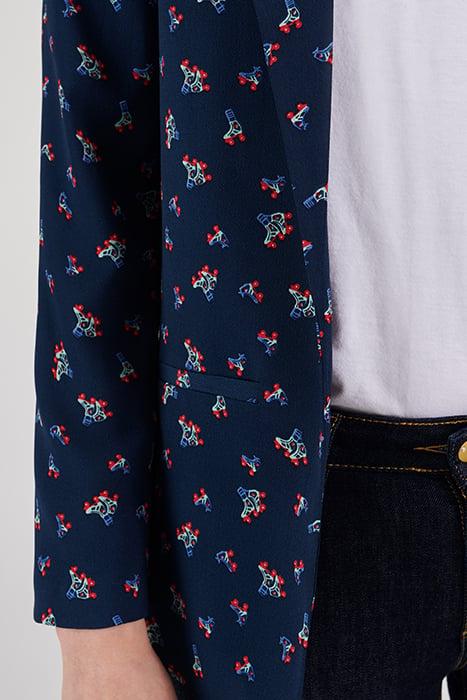 - Women's navy jacket - Suit collar, long sleeves - 2 piped side pockets - Exclusive rollerskate print, designed by I.Code - Plain lining, open