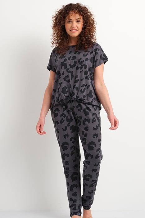 This Lounge Top From Livera Is Dark Gray With Black Leopard Print. In The Tiara Top There Is A Nice Knot Detail At The Bottom For A Playful Effect. Combine This Faded Animal T-Shirt Together With The Faded Animal Long Pants For A Cool And Comforable Lounge Set.