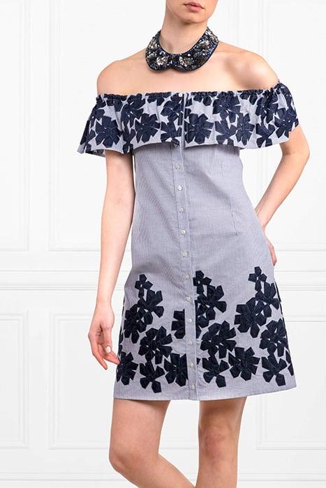 The PALAURA is a yarn dyed striped shirt dress embellished with patchwork embroidered flowers. The ruffled neck is elastic so it can be worn on or off the shoulders. The PALAURA features a classic front button tab and a removable belt that allow you to cinch your silhouette.