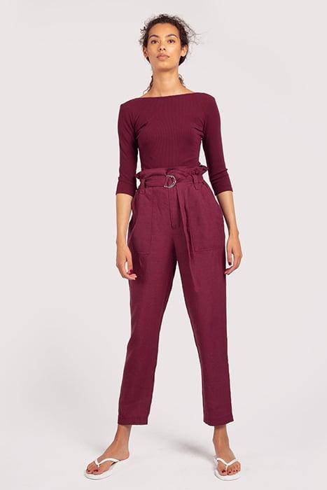 Linen trousers in paperbag model. The pants have a matching belt with D-ring and are tapered.