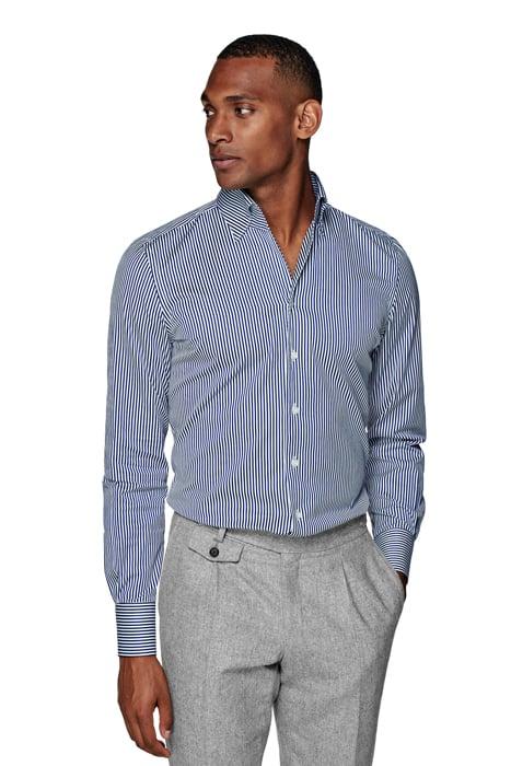 • Tailored to an extra slim fit, this soft navy striped shirt features a single cuff and hidden button-down. This one-piece collar construction is cut from a single piece of cloth extending up from the torso which allows the collar to stand firmly without requiring the top button found on traditional collars.