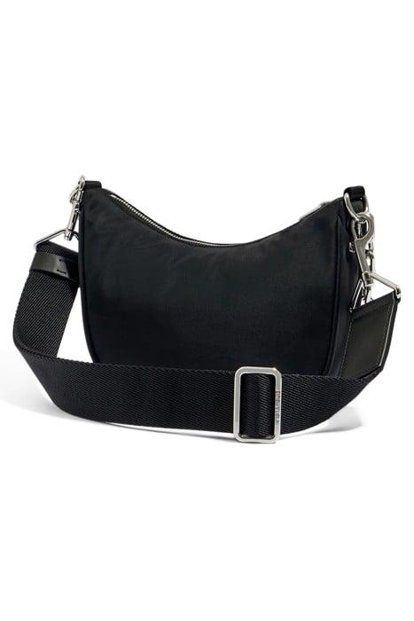 Nylon Half-Moon Crossbody Bag In Black. Small Model With Zip Fastener, Chain Handle And Removable Strap. Exterior Customized With Enamel Chimo Logo. This Model Contains 100% Recycled Polyester.