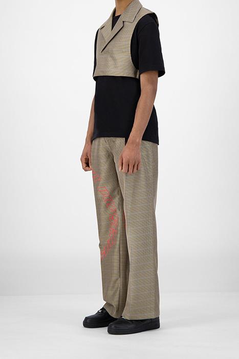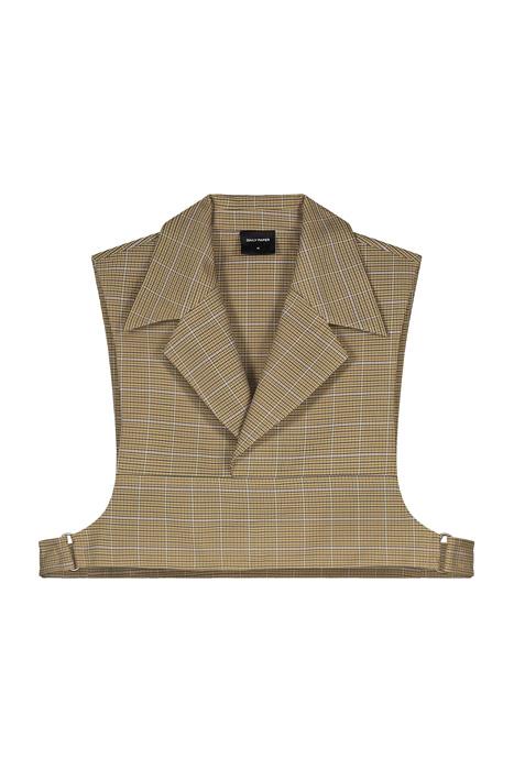 A tailored take on the tactical bullet-proof vest, this spin on a utility vest features the lapels of piece of outerwear and is constructed from a heritage check knit fabric. The vest is fastened at the side using two velcro straps. A small woven label beneath the collar adds to the fresh-out-of-the-tailors aesthetic.