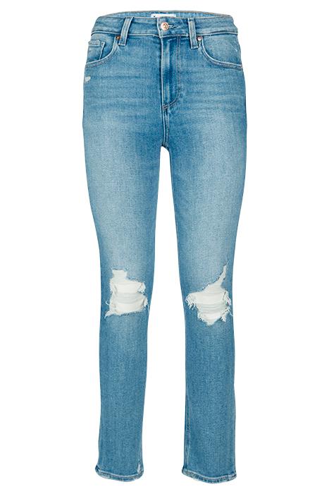 Featuring our highest rise, this slim straight leg falls somewhere between a skinny and a true straight for a modern and versatile fit. This instant-favorite is cut from PAIGE Vintage denim and comes in an easy, medium blue wash that has a naturally worn-in, vintage vibe with torn knees and destruction on the back pocket. PAIGE Vintage takes all of the work out of breaking in your favorite pair of vintage jeans. We've combined the comfort of stretch with everything you love about authentic vintage denim to create super soft jeans that feel perfectly lived-in from the very first wear.
